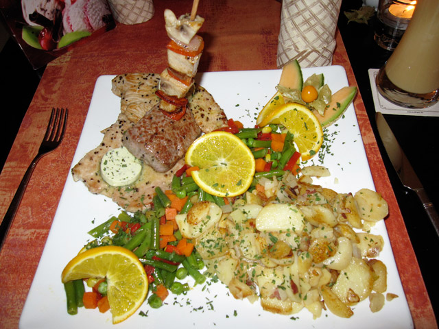 freundlich und zuvorkommend und die Speisekarte sehr übersichtlich. Es gibt eine Auswahl von Salaten, Fisch und Fleischgerichten, selbst vegetarisches war zu entdecken und eine Kinderkarte. Nach der Getränkebestellung bestellten wir dan unsere Speisen. Ich nahm den Grillteller Störtebeker – 17 € – und war doch eher skeptisch. Sehr hoher Preis und wahrscheinlich ein winziger Teller mit 4 kleinen scheiben Fleisch. und einem haufen Gemüse und Bratkartoffeln. Die weiteren Gerichte waren Schnitzel mit Pommes und ein Salat mit Thunfisch und als extra-Wunsch noch Champis. Mein Gericht wurde anstelle einer Paptika-Rahm Soße mit Kräuterbutter angerichtet. Also extra-Wünsche scheinen kein Problem zu sein.